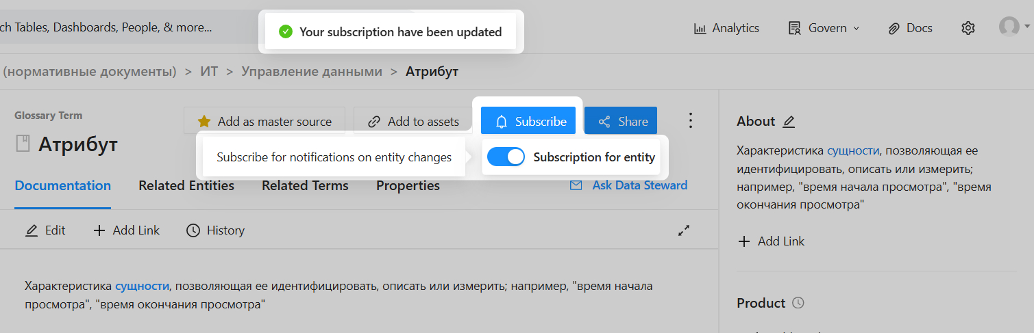 Подписаться можно не на все объекты внутри Каталога данных, сюда не входят Люди (People) и Теги (Teg). При подписке на домен вы не подпишетесь на все под-домены. Подписка на домен также не подпишет вас и на все связанные с ним объекты (Entities).