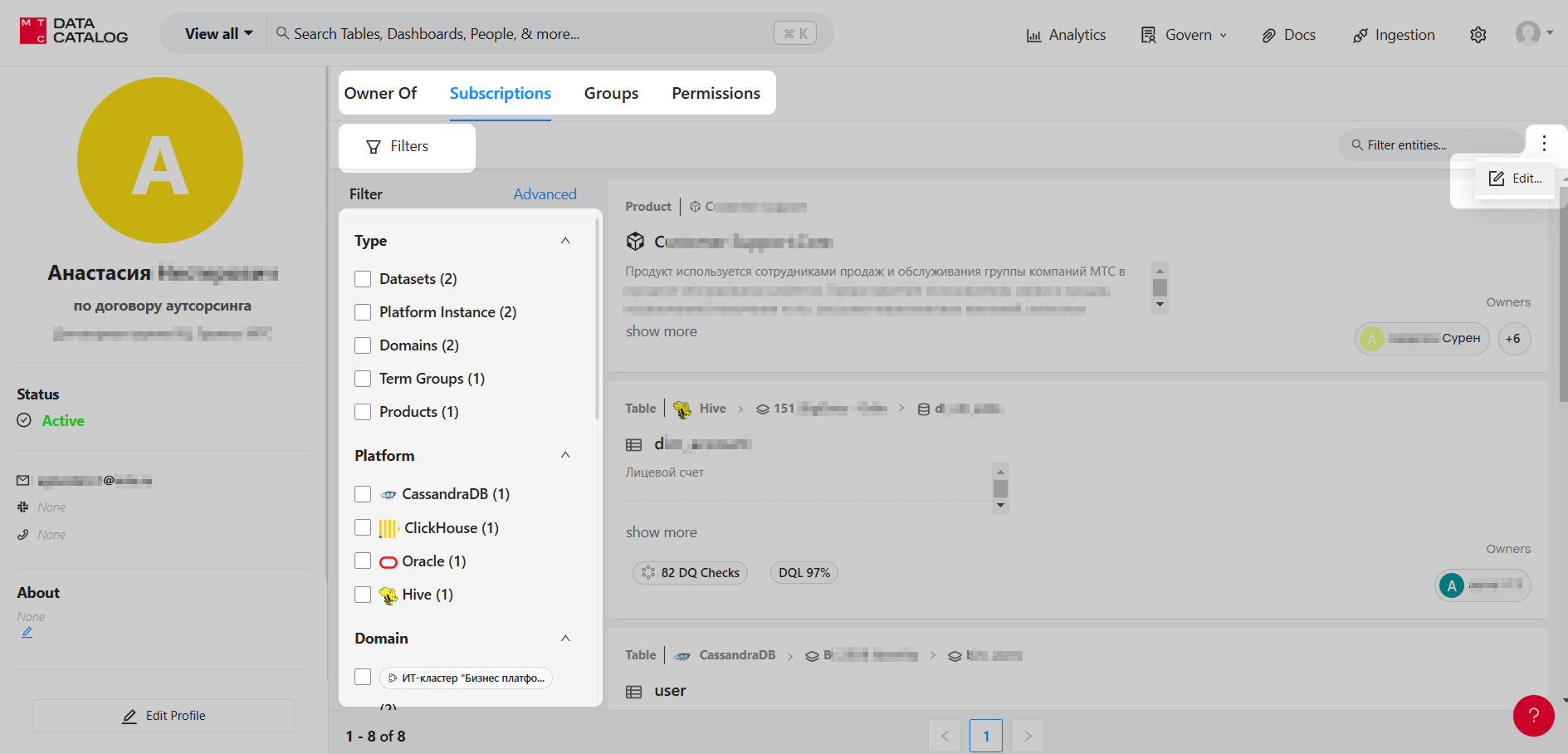 На вкладках Owner Of, Subscriptions, и Permissions можно отфильтровать объекты, воспользовавшись кнопкой Filters. По нажатию на эту кнопку, появится левая боковая панель с возможностью выбора необходимых фильтров. Они уже учитывают то, какие объекты показаны на странице, поэтому имеют упрощенное представление по сравнению с фильтрами на главной странице Каталоге.