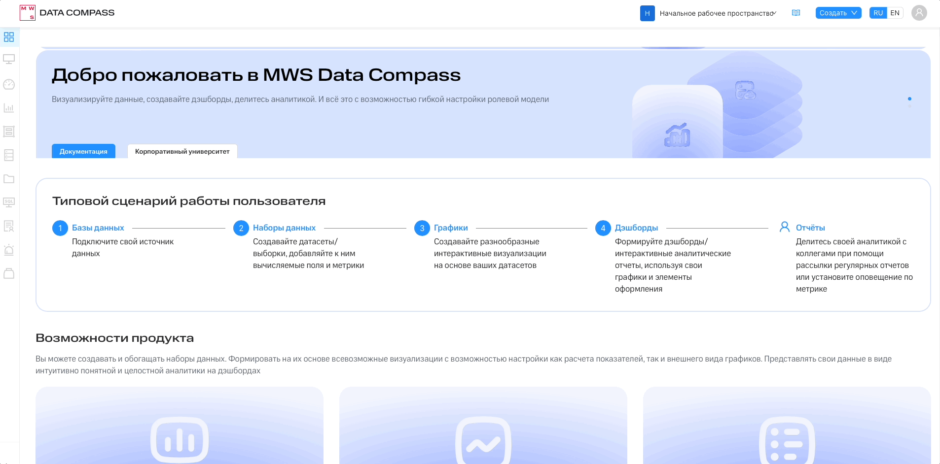 MWS Data Compass — это облачный инструмент, разработанный командой МТС, который предоставляет расширенные возможности для анализа и визуализации данных. Он является частью платформы MWS Data и ориентирован на упрощение работы с данными для пользователей различного уровня.