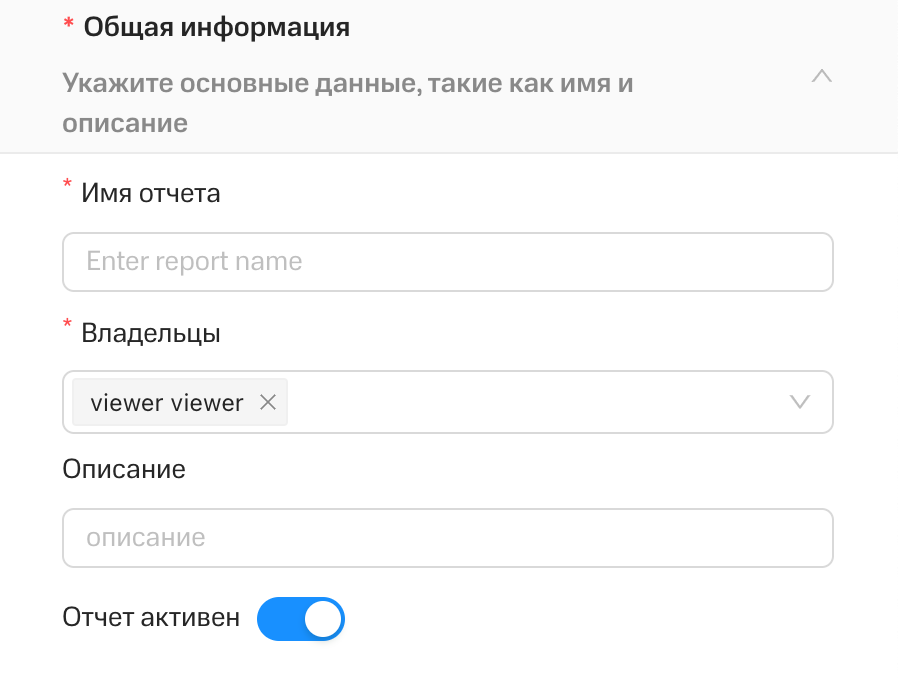 - В разделе "Общая информация" укажите имя отчета, выберите дополнительных владельцев (если необходимо) и добавьте описание.