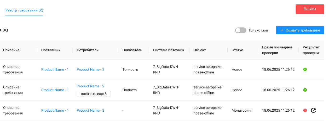 Требование — это запись в реестре, которая описывает требование потребителя к определенной характеристике качества данных. Если требование связано с проверкой качества данных в MWS Data Test, статус выполнения проверки отслеживается в реестре.