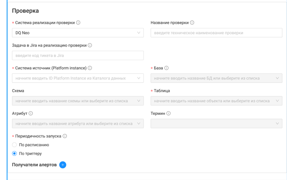 - Получатели алертов (необязательное) — выберите из списка лиц для уведомлений о неудачных проверках.