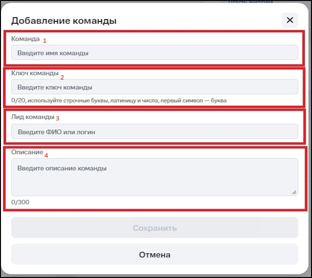 - Описание - краткое описание команды или ссылка на Confluence (до 300 символов)