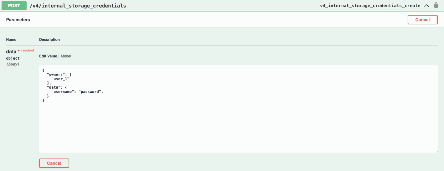 Шаг 1. Сохраняем данные от источника отправляя запрос на /v4/internal_storage_credentials
